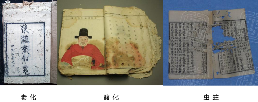紙質文獻的損壞原因有:內在原因如原材料、手工造紙/機械造紙技術等。外在原因如溫度、濕度、光照、有害氣體、粉塵、霉菌、昆蟲、人為損害等。紙質文獻的常見損壞類型有老化、酸化、蟲蛀、霉變、粘連等。文獻修復師需要根據文獻損壞情況制定針對性的修復方案。