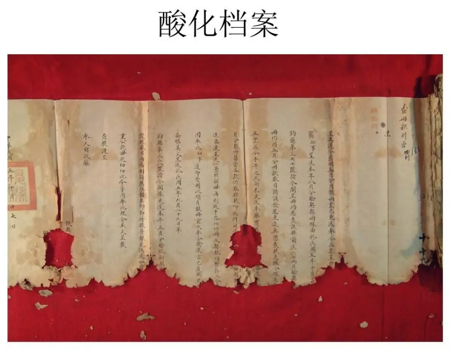 當前,各級檔案館、圖書館的紙質檔案文獻均有不同程度的酸化現(xiàn)象,民國檔案文獻的酸化問題尤其嚴重。國家圖書館“館藏紙質文獻酸性和保存現(xiàn)狀的調查與分析”課題,對館藏15類紙質文獻的酸性和變質程度進行了全面檢測,結果顯示館藏各類紙質文獻的平均pH值都低于未酸化值6.8,呈現(xiàn)酸性。其中,pH值低于6.1的占84%,pH值低于5.0嚴重酸化的占62%。民國文獻紙張的平均pH值低于4.5,表明目前館藏民國文獻已全面受損,發(fā)生中度以上酸化受損的文獻比例達到90%以上,而民國初年的文獻更是100%受損。