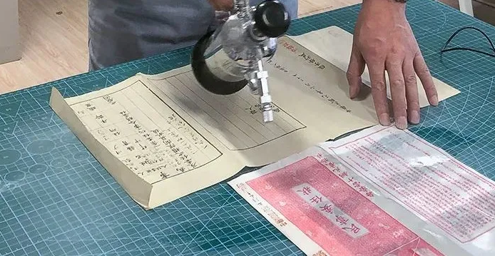 經過脫酸處理后的紙張上的油墨印刷字跡圖案、手寫字跡及各種顏色印章等顏料層無開裂、無脫落、無洇化,脫酸過程中對水性字跡無任何影響。