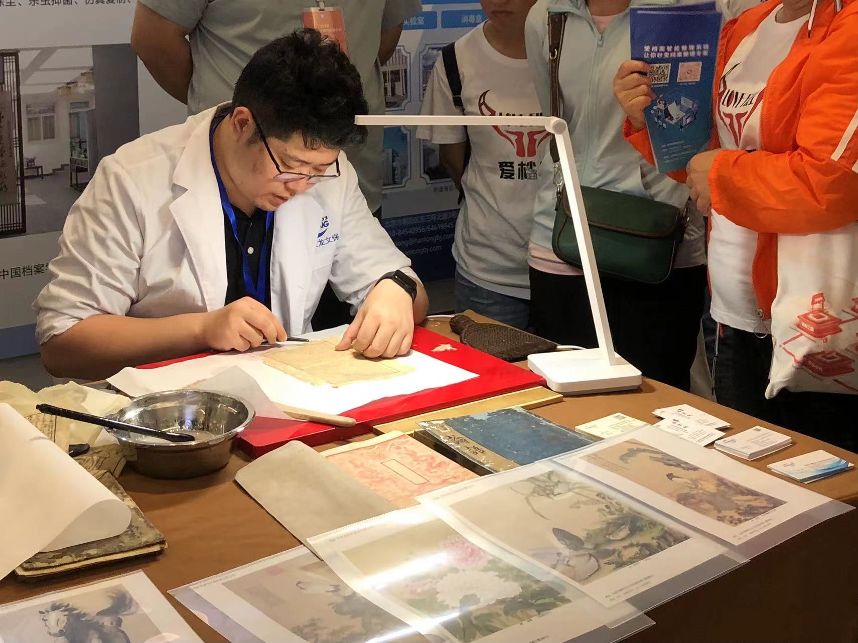 北京市漢龍實(shí)業(yè)有限公司還現(xiàn)場進(jìn)行了文獻(xiàn)修復(fù)演示,并展示了破損檔案、古籍、字畫修復(fù)前后對比圖,公司制作的文獻(xiàn)仿真復(fù)制件,以及采用仿真復(fù)制技術(shù)制作的文創(chuàng)產(chǎn)品,大批觀眾對公司的文獻(xiàn)修復(fù)、仿真復(fù)制工藝贊嘆不已。