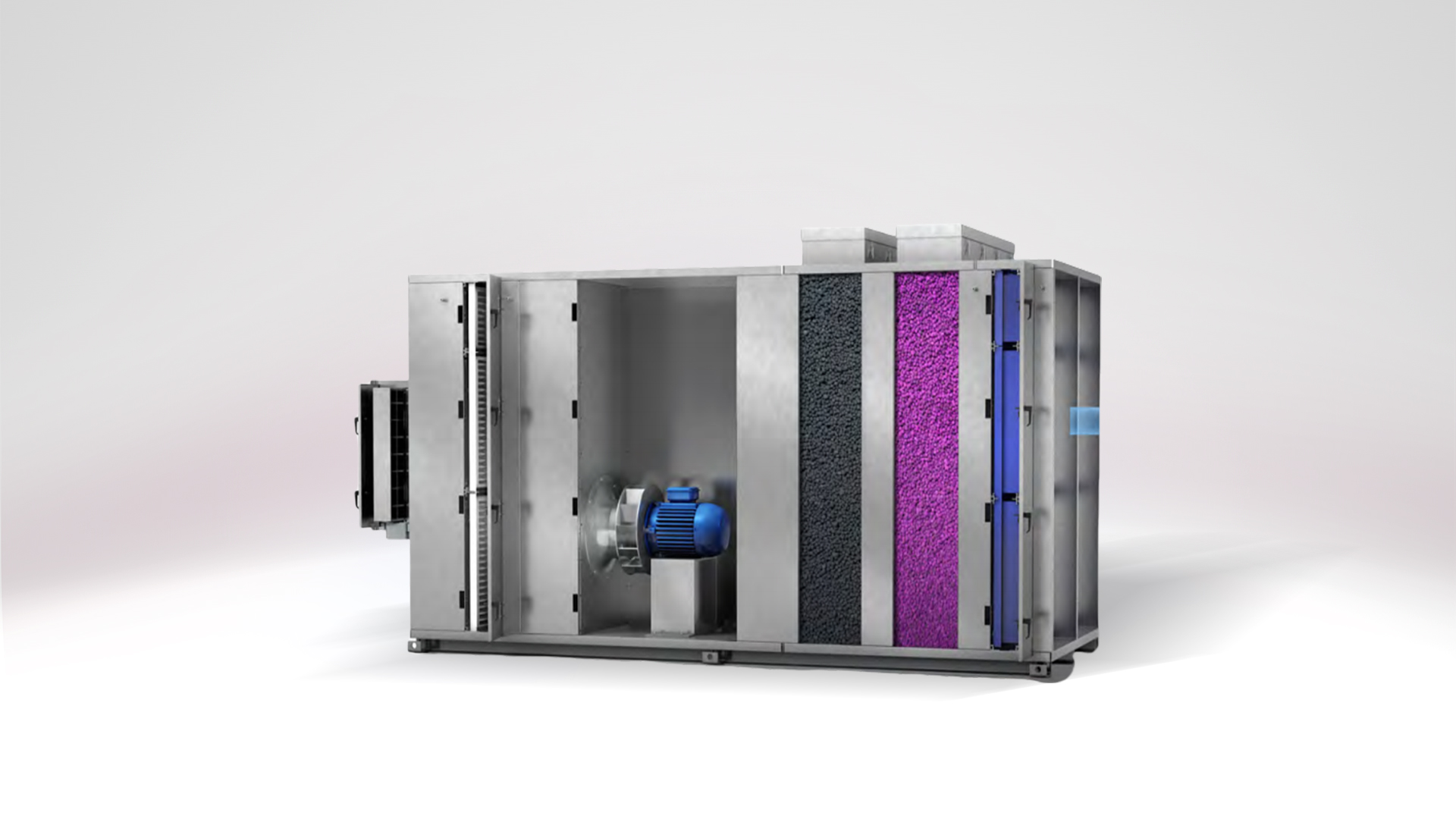 機(jī)組由G3初效灰塵過濾器、多段高效化學(xué)過濾系統(tǒng)、F7中效灰塵過濾器和風(fēng)機(jī)部件組成。經(jīng)初效灰塵過濾器對(duì)空氣中較粗的飄塵粉塵截流過濾。PSA系統(tǒng)中化學(xué)過濾段采用模塊式設(shè)計(jì),使更換化學(xué)濾料時(shí),無(wú)需其他特殊工具,僅需將濾料箱內(nèi)的模塊取出并更換新的化學(xué)濾料模塊即可。