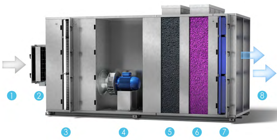 1. 污染的空氣 2.除霧器進(jìn)風(fēng)口 3.前置過濾器 4.送風(fēng)口 5.初始媒介通道 6.高級(jí)媒介通道 7.終端過濾器 8.高質(zhì)量的空氣