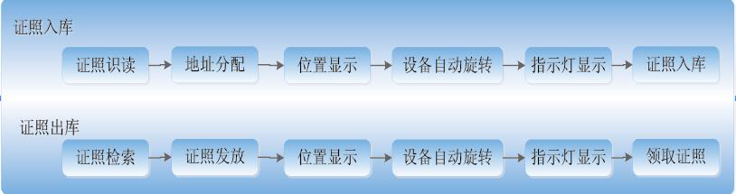 證照存放于存貯庫中,科學(xué)碼放,規(guī)范保存、準(zhǔn)確定位。采用智能化程序控制,密碼登錄,保證證照出入庫安全。